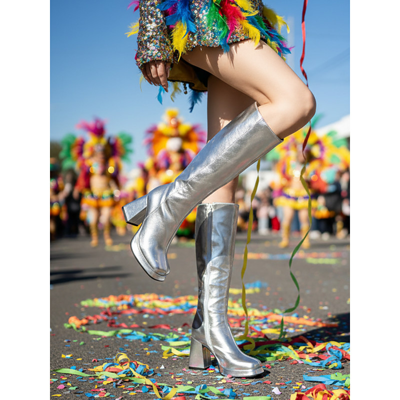 Women's Gold Metallic Knee-High Boots with Chunky Block Heel – Bold Statement Shoes for Carnival, Festivals and Costume Parties