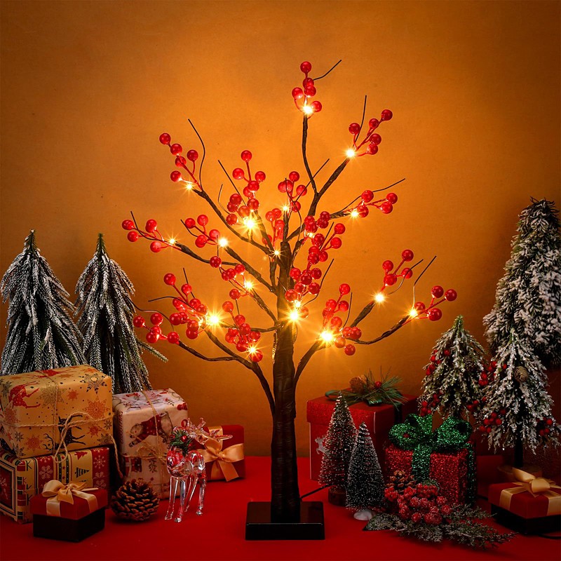Red fruit simulation tree decorative light 53cm/20.87Inch 24Leds Spring Festival New Year indoor bedroom living room dining room holiday decoration props ornament light AAA battery USB dual-use
