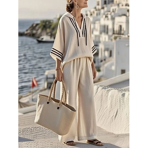 set di pantaloni in cotone da donna, top bolero, manica a 3/4, con cappuccio, a righe, moda streetwear casual quotidiano, per attività all'aperto, blu bianco cammello, estivo, vestibilità ampia