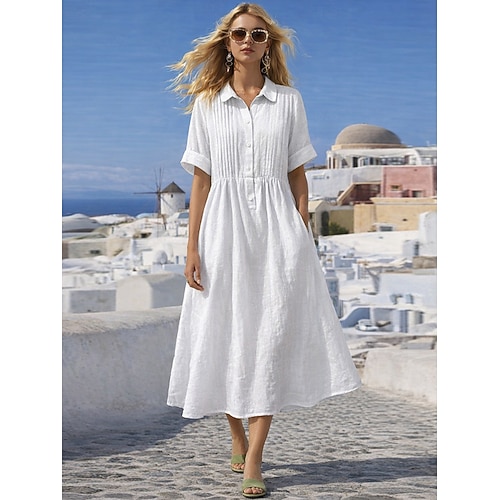 abito midi da donna in cotone e lino, abito chemisier, abito caftano, moda, moderno, quotidiano, all'aperto, vacanza, vestibilità regolare, semplice, manica corta, colletto della camicia, blu, bianco, rosa, rosso, estate, primavera