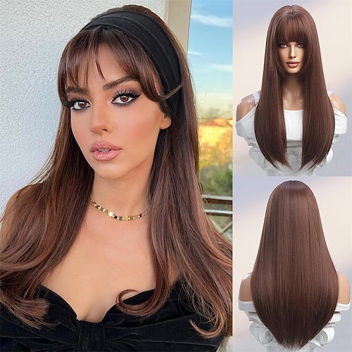 parrucca dorata ombré con frangia - capelli lunghi e lisci, radici scure e lievi riccioli verso l'interno alle punte - capelli sintetici resistenti al calore per donna - ideale per feste quotidiane e