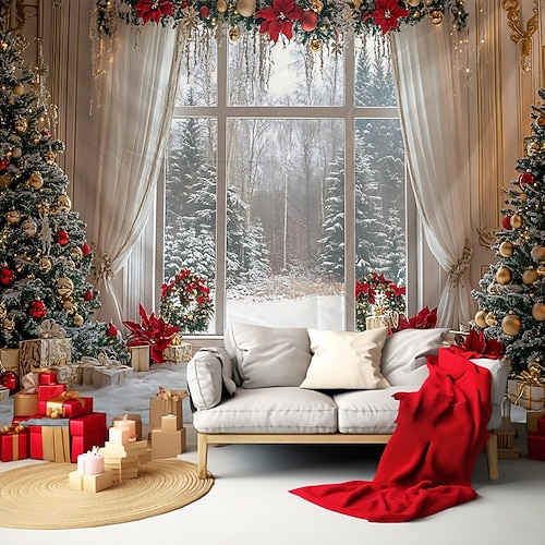 Arazzo natalizio appeso, pupazzo di neve fuori dalla finestra, Babbo Natale, albero di Natale, grande decorazione murale da parete, coperta, tenda, casa, camera da letto, soggiorno, decorazione festiva stagionale per feste.