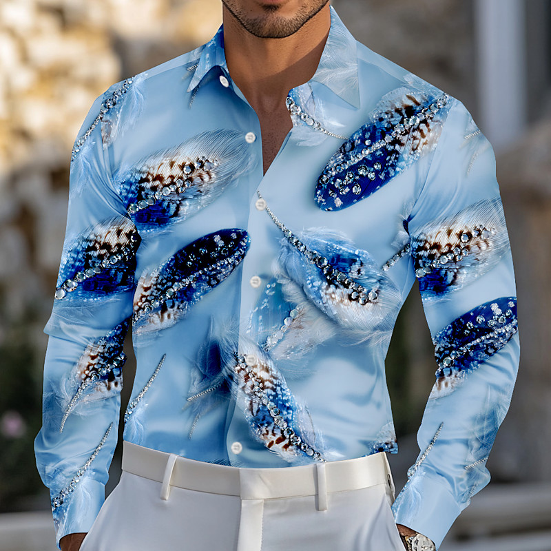 Mardi Gras Men's Feathers Dazzle color Carnival Shirt Satin Shirt Dress Shirt Long Sleeve Fashion Casual Party Holiday Summer Spring Turndown 3D Print Button Up Shirts Blue Yellow Purple