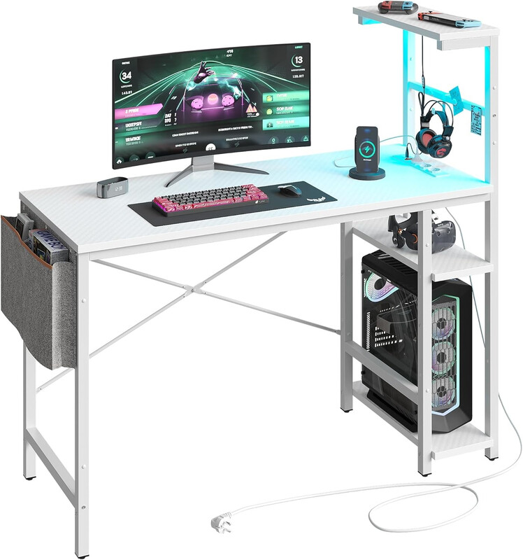Bestier 113 cm Eck-Computertisch mit Steckdosen, Computertisch mit LED-Beleuchtung, Reversibler Tisch mit Seitentasche, Aufbewahrungstasche & Zubehörhaken für Home Office, kleine Räume, Weiß