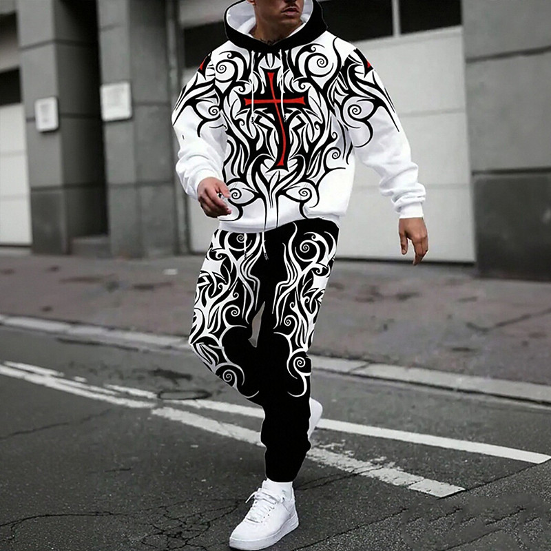 Men's Graphic Cross 2pcs 3D Sweatshirt Sets Tracksuit Hoodie Sweatshirt Long Sleeve Long pants Hooded Streetwear Casual Daily Street Athleisure 3D Print Spring Fall Winter Black-white