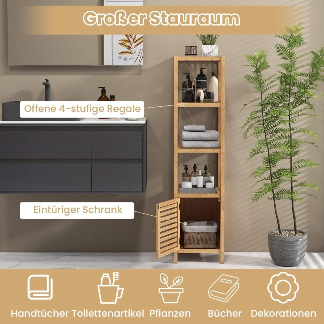 Bambu kylpyhuonehylly, jossa 4 hyllytasoa ja säleovi 34 x 33 x 140 cm luonnollinen