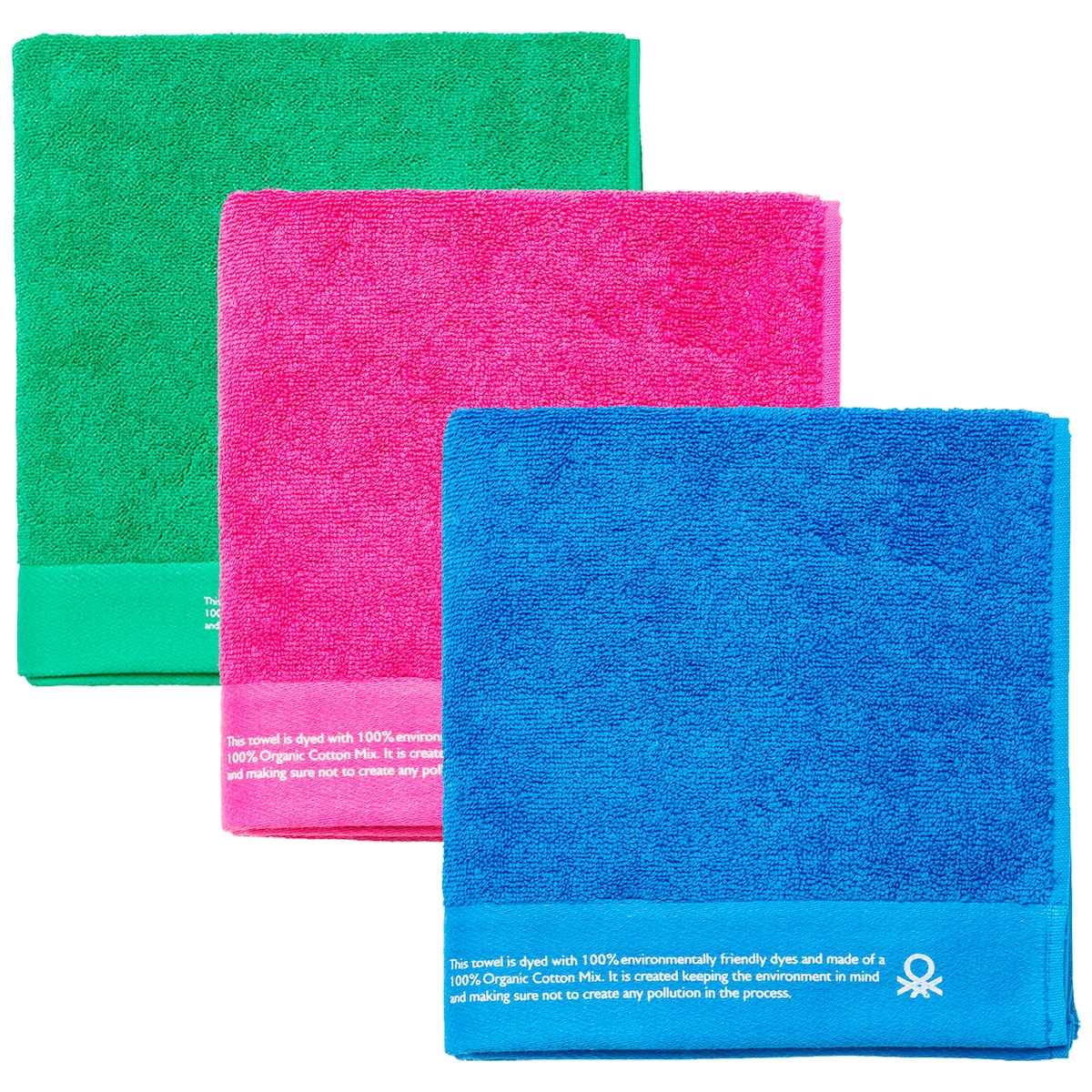Benetton – Set mit 3 Handtüchern 70 x 140 cm, Bio-Baumwolle, 450 g/m², Blau, Rosa und Grün