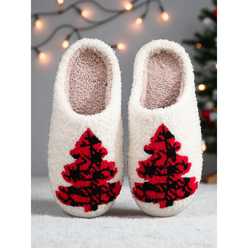 Women's White Christmas Tree Slippers with Plush Lining, Cozy Winter House Shoes for Holiday Party Gift Giving