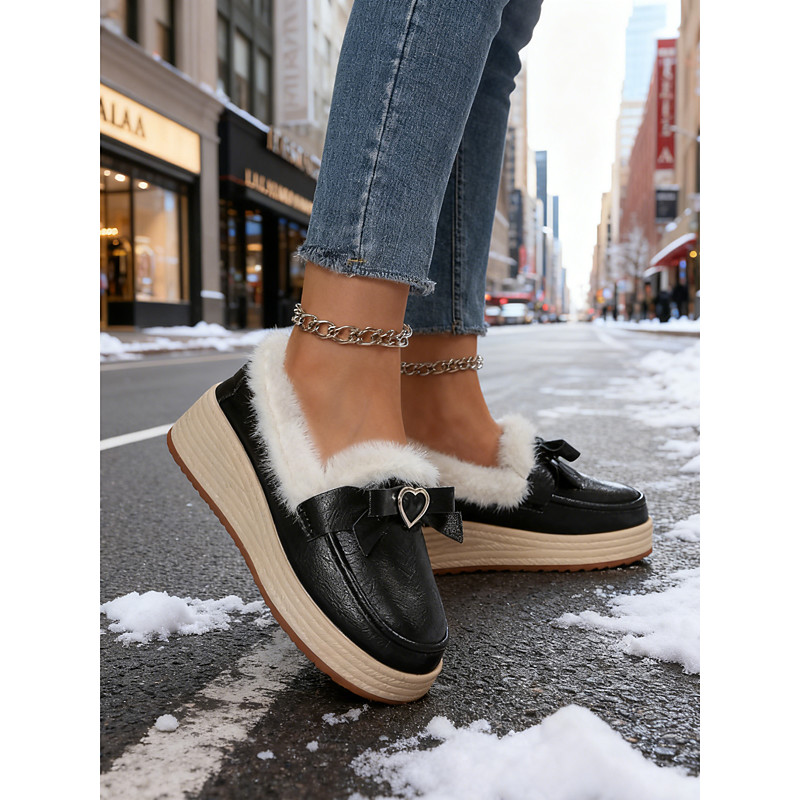 Women's Beige Loafers with Faux Fur Lining and Bow Detail, Comfortable Slip-On Shoes with Heart Shaped Metal Charm, Stylish Winter Footwear for Casual and Everyday Wear