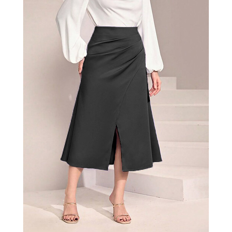 Women's Skirt Elegant Fashion Casual Midi Mid Rise Skirts Plain Ruched Split Ends Micro-elastic Daily Street Black Orange Green Beige Summer Polyester