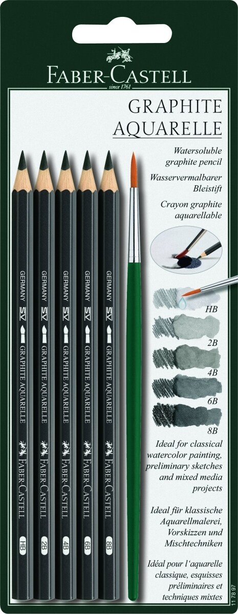 FABER CASTELL Bleistift Graphit Aquarelle 5 Härtegrade + Pinsel auf Blisterkarte Packung mit 5 Stück