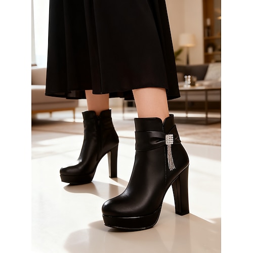 stivaletti neri da donna con dettagli in strass: stivali con plateau in stile serale chic per occasioni formali, feste e serate fuori