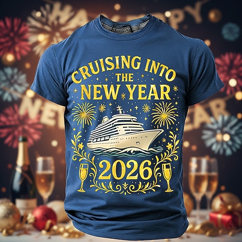 Neujahr Herren glückliches neues Jahr Feuerwerk Kreuzfahrtschiff 2026 T Shirt Kurzarm T-Shirt 3D-Druck Rundhalsausschnitt Hemd Übertrieben Designer Künstlerisch Party Straße Club Blau 1# Schwarz Rote