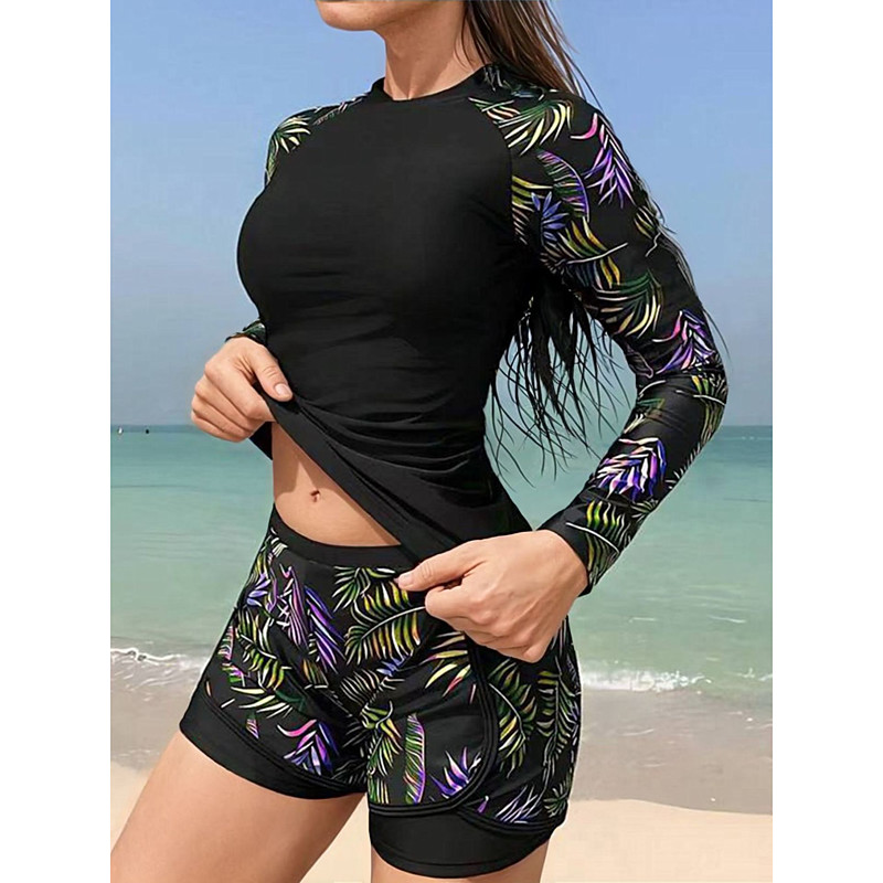 Women's Tankini 2 Piece Swimsuit Palm High Waist Tummy Control High Waist Slim Vacation Beach Wear Floral Leaves Round Neck Long Sleeve Bathing Suits