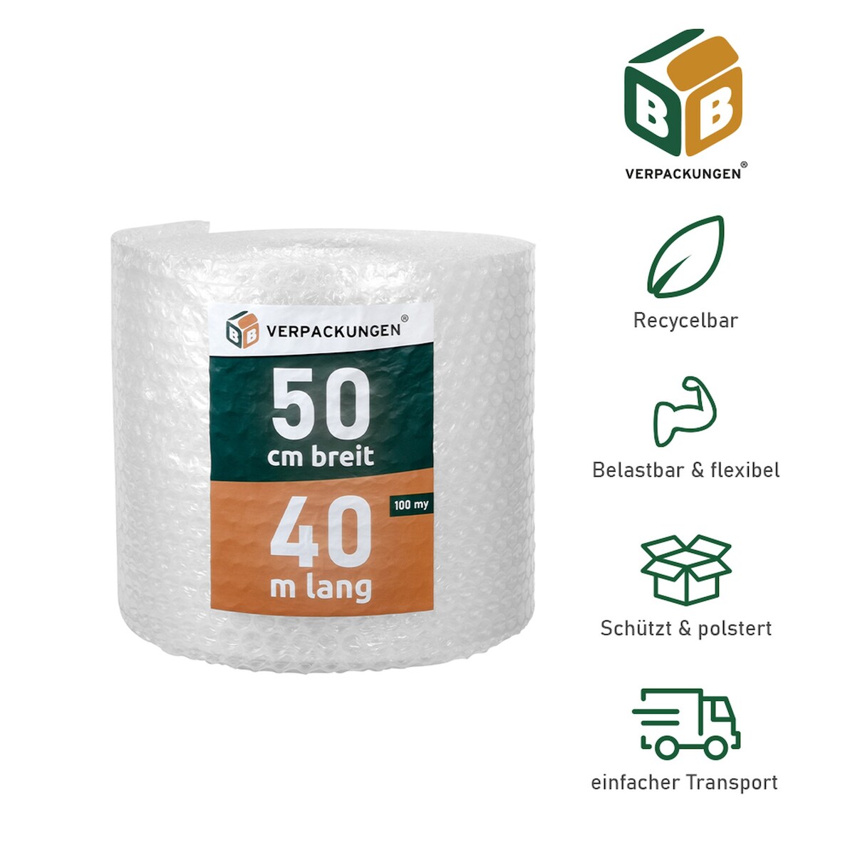 BB-Verpackungen GmbH 8 x Luftpolsterfolie (0,5 x 40 m) 2-lagig 100 my Große Noppen Versandfolie Polster Verpacken Knallfolie Transport BB-Verpackungen