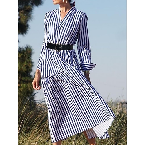 Per donna Abito Midi Abito a trapezio Casual Quotidiano Vestibilità regolare A righe Manica Lunga Scollo a V Blu Nero Verde Estate Primavera Autunno