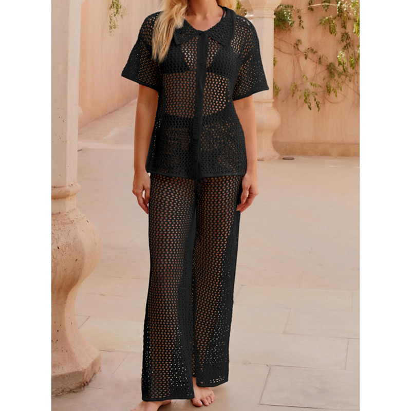 Women's Swimwear Cover Up 2 Piece Swimsuit Cut Out Knitted Vacation Beach Wear Solid Color Round Neck Short Sleeves Bathing Suits