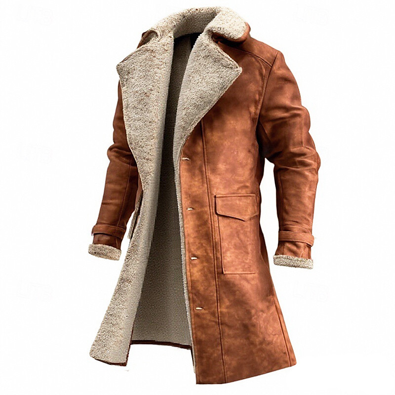 Men's Faux Leather Jacket Winter Coat Fleece Jacket Casual Jacket Outdoor Casual Thermal Warm Pocket Buttons Fall Winter Plaid Vintage Streetwear Turndown Long Brown Jacket