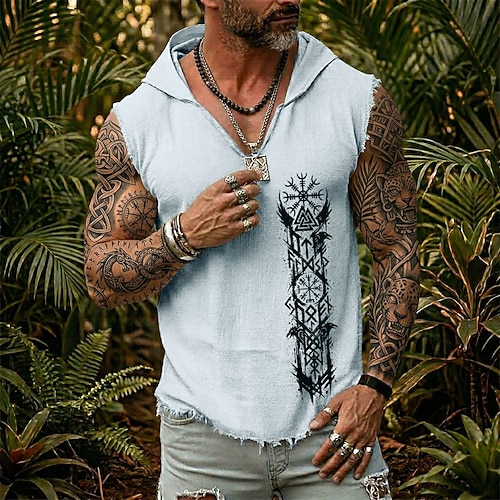 Herren-Weste mit Kapuze, Vegvisir Valknut-Muster, nordischen Runen, Raben, Wikinger-Krieger-Motiv, Boho-Stil, ärmellos, aus Baumwoll-Leinen-Mischgewebe, ausgefranstem Saum, lockerer Passform, Sommer,