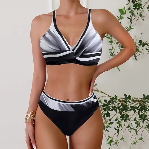 Bikini da donna 2 pezzi costume da bagno colorblock alta vita snellente senza schiena vacanza beach wear striscia scollo a V senza maniche