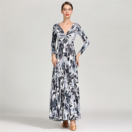 abito da ballo da sala con stampa floreale per donna - abito a trapezio a maniche lunghe con maniche trasparenti per competizioni, latino e eventi di danza - bluamp; bianco