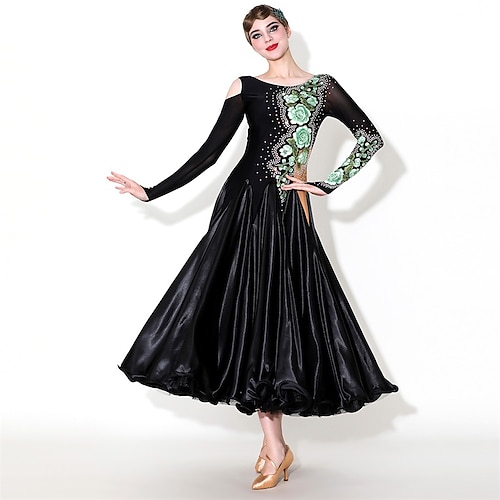 abito da ballo da sala da donna, asimmetrico, floreale, in raso, con ricami, maniche lunghe, elegante abito da competizione per valzer, tango, foxtrot – nero verde