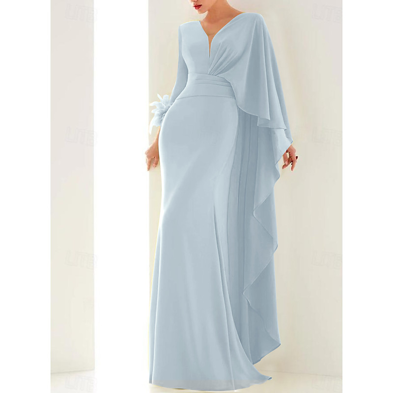 Mermaid Trumpet Floor Length Ball Gown with Cape Evening Gown Formal Dress Elegant Long Sleeve V Neck Formal Fall Chiffon with Feather Ruched Ruffles