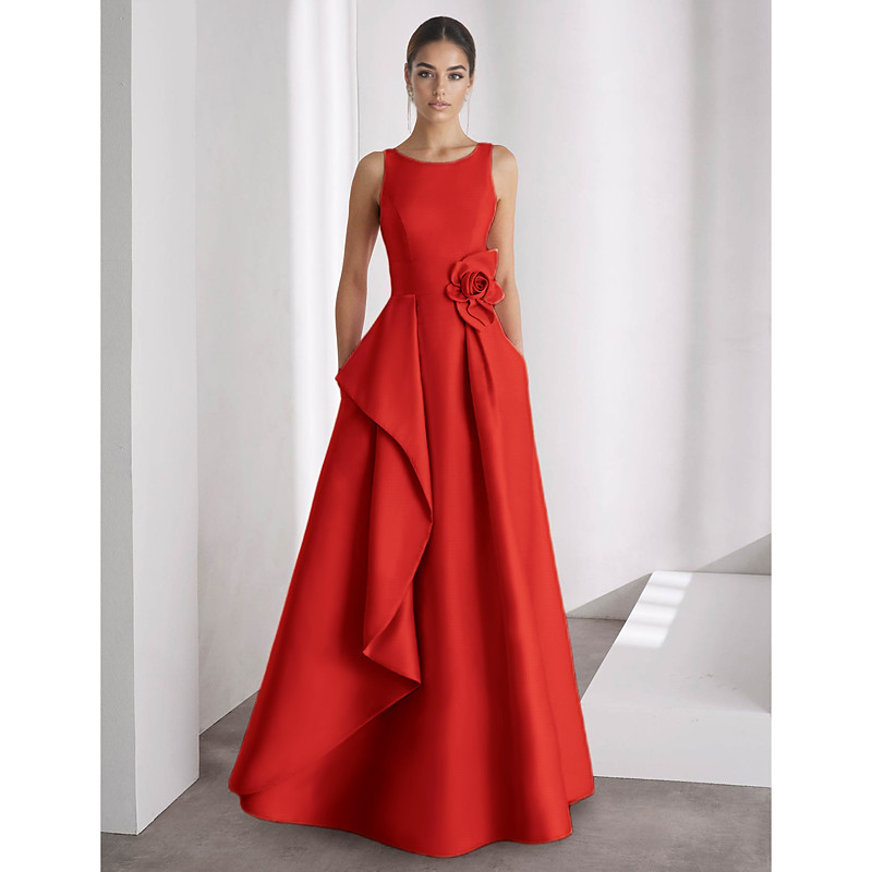 A-Line Floor Length Evening Gown Ball Gown Formal Dress Elegant Vintage Sleeveless Off Shoulder Wedding Formal Pocket Satin with Ruffles