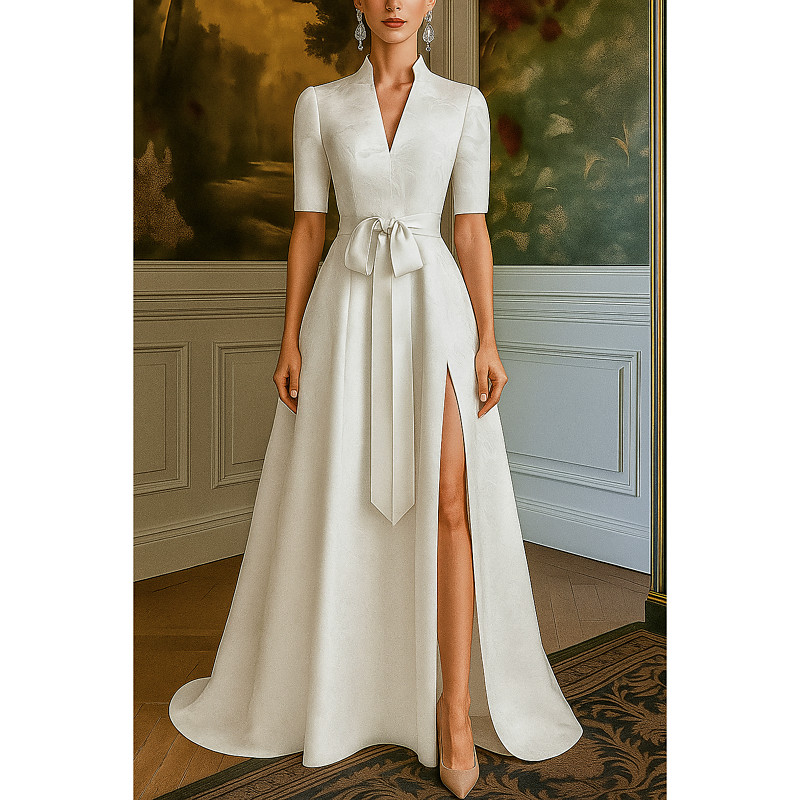 A-Line Asymmetrical Ball Gown with Cape Evening Gown Formal Dress Elegant Long Sleeve V Neck Wedding Formal Pocket Satin with Pleats Pocket