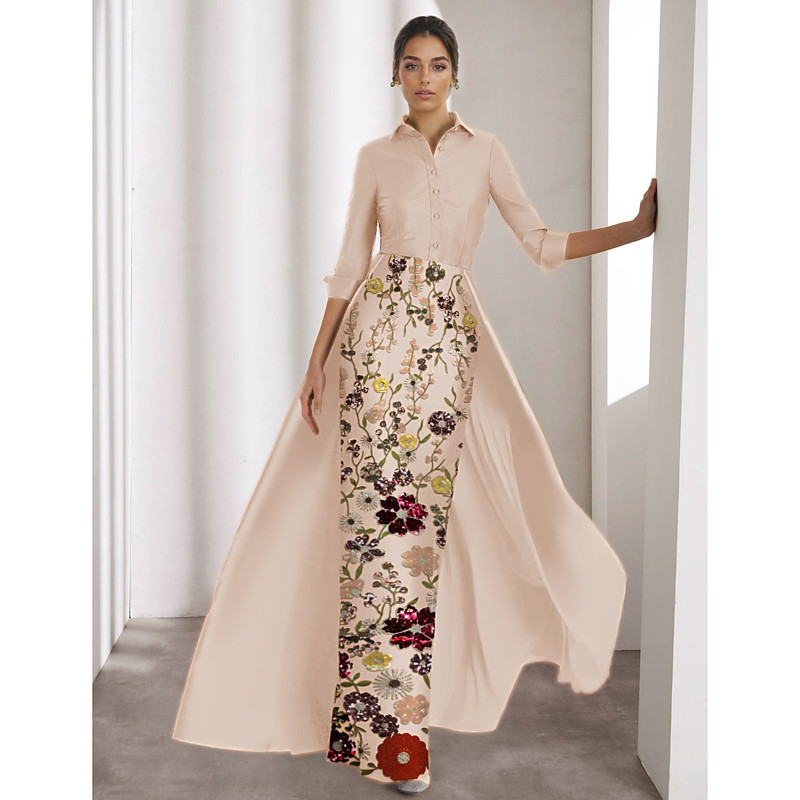 Sheath Column Floor Length Beaded Eembroidered Formal Dresses Mother of the Bride Dress Evening Gown Ball Gown with Overskirt Formal Dress Elegant Vintage Color Block Long Sleeve Shirt Collar Wedding