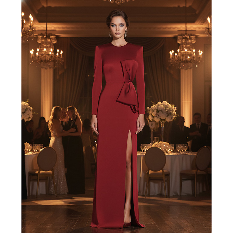 Sheath Column Floor Length Prom Dresses Evening Gown Ball Gown Formal Dress Elegant Glittering Celebrity Style Long Sleeve Crew Neck Garden Party Wedding Satin with Bow(s) Slit