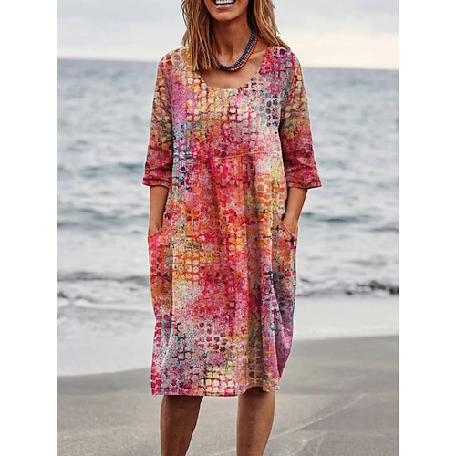 Per donna Abito Midi Finto cotone e lino Abito Boho Abito a Tubino Vestito Casual Vintage Quotidiano All'aperto Spiaggia Vestibilità comoda Floreale Mezza Manica Girocollo Blu Rosa Arancione Verde