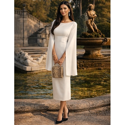 Tubino Colonna Lunghezza Tè Abiti da Cocktail Abiti da festa Elegante Festa Piccoli Abiti Bianchi Manica Lunga Collo gioiello Ospite di nozze Ferie Invitato a matrimonio autunnale Jersey Senza schiena