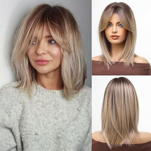 Parrucche bionde per donna, parrucca a strati lunga fino alle spalle con radici scure, parrucca sintetica corta con frangia per uso quotidiano o cosplay.