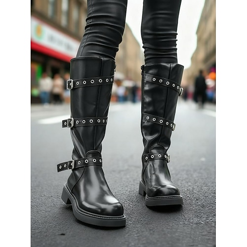 stivali da equitazione alti fino al ginocchio da donna punk - stivali gotici in similpelle con cinturino e fibbia e rivetti per Halloween, festival e stile streetwear