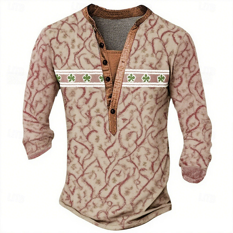 Men's Print Clover T Shirt Henley Shirt Long Sleeve Designer Retro Vintage Bohemian Street Casual Daily Summer Spring Fall Blue Brown Green khaki Grey Henley Henley T-Shirt