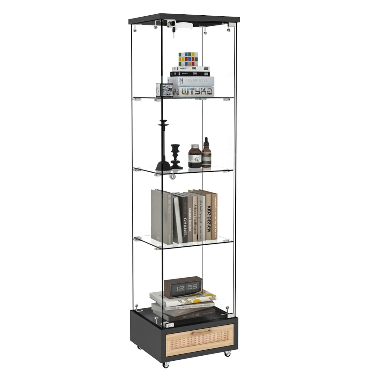 Merax Glasvitrine mit LED, Vitrinenschrank gehärtetes Glas, mit Schublade & Rollen, Standvitrine modern, H167×B42.5×T36.5 cm, Schwarz