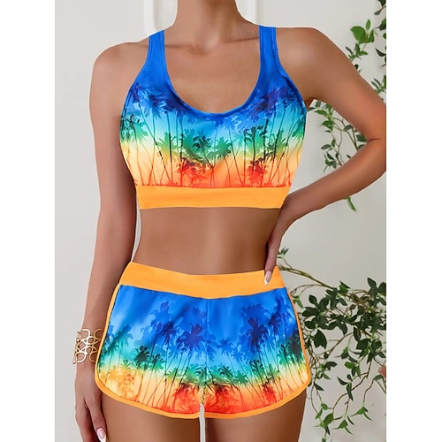 Women's Bikini 3 Piece Swimsuit Palm Cheeky Slim Backless Vacation Beach Wear Floral Color Block V Neck Sleeveless Long Sleeve Bathing Suits