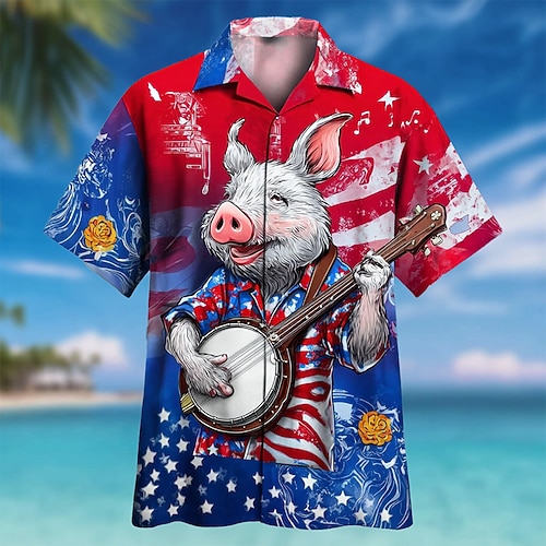 Herren Schwein US Flagge 250. Jahrestag der Vereinigten Staaten Hemd Knopfhemd Kurzarm Modisch lässig Outdoor Ferien Sommer Frühling Umlegekragen 3D-Druck Hemden mit Kragen Rot 1 Rote Rot 2