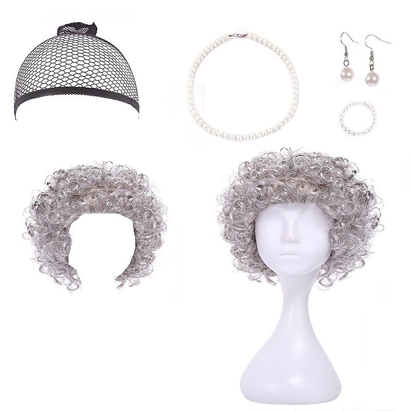 Old Lady Wig with Pearl Necklace Earrings Set for Women Girls Grandma Cosplay 100 Days of School Costume Halloween Party Accessories