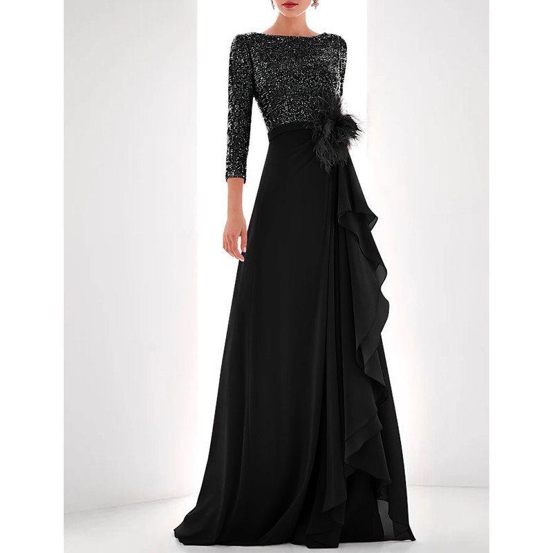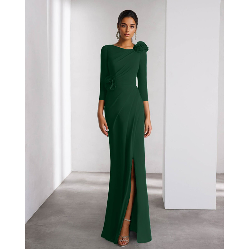 Sheath Column Floor Length Cocktail Dresses Prom Dresses Evening Gown Ball Gown Elegant Vintage 3/4 Length Sleeve Jewel Neck Formal Chiffon with Ruffles Shouder Flower