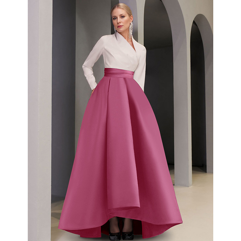 A-Line Asymmetrical Evening Gown Ball Gown Formal Dress Elegant Silky Long Sleeve V Neck Formal Pocket Satin with Pocket