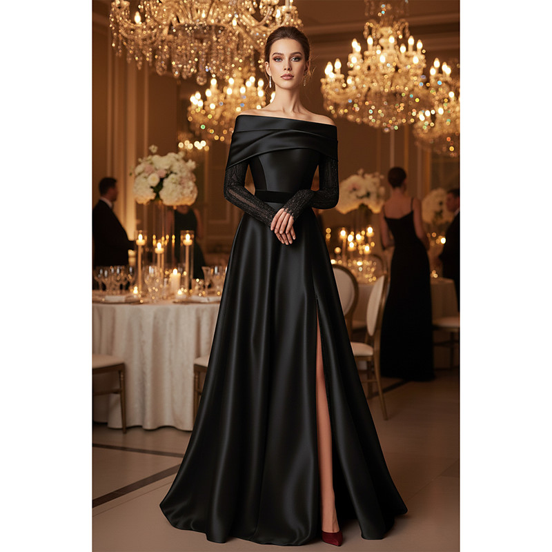 Sheath Column Sweep Brush Train Evening Gown Ball Gown Formal Dress High Split 3/4 Length Sleeve Off Shoulder Formal Wedding Guest Charmeuse with Bow(s) Sequin Slit
