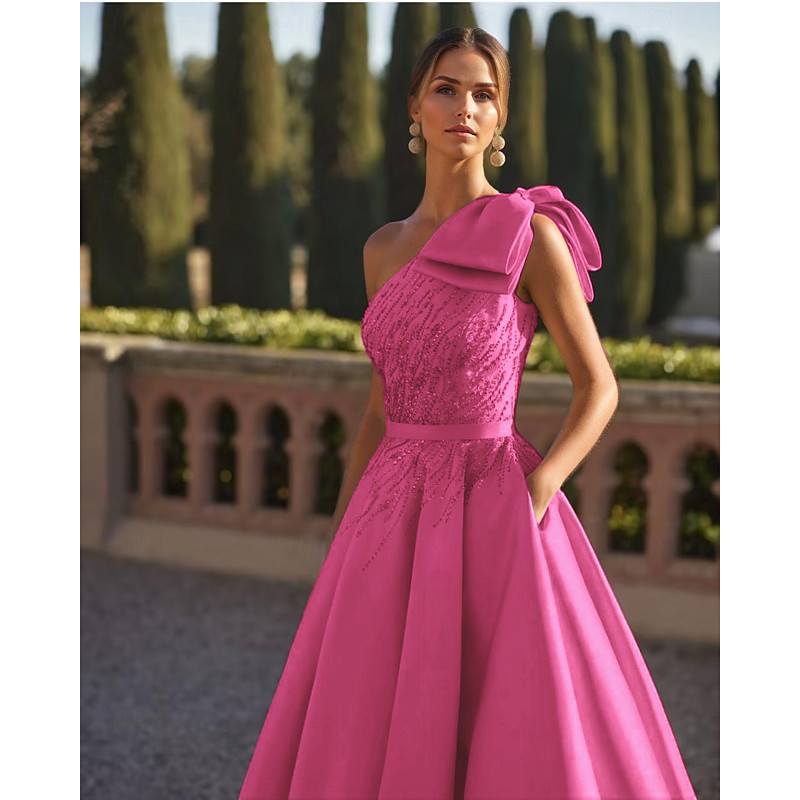A-Line Floor Length Evening Gown Ball Gown Formal Dress Elegant Sleeveless One Shoulder Garden Party Wedding Satin with Glitter Bow(s) Beading