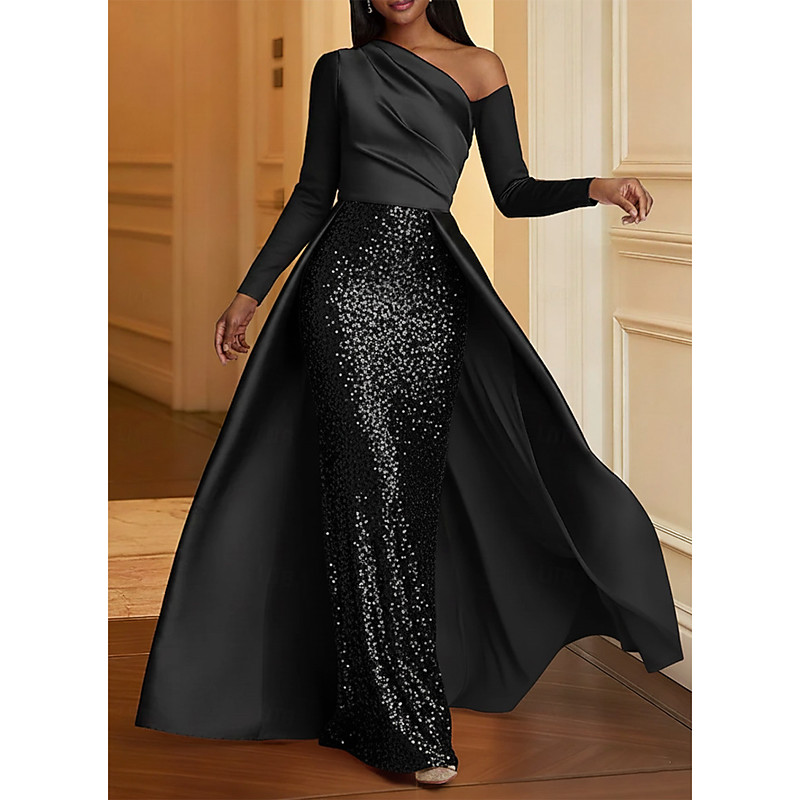 Mermaid Trumpet Floor Length Evening Gown Ball Gown with Overskirt Formal Dress Elegant Glittering Sparkle Long Sleeve One Shoulder Wedding Formal Stretch Satin Sequined with Glitter