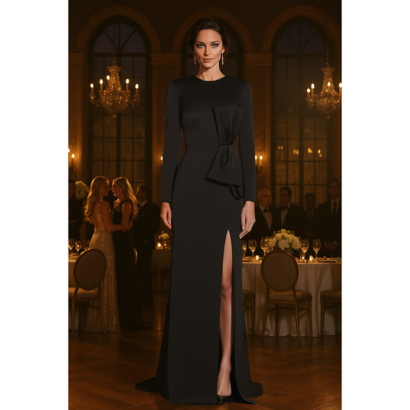 Sheath Column Floor Length Prom Dresses Evening Gown Ball Gown Formal Dress Elegant Glittering Celebrity Style Long Sleeve Crew Neck Garden Party Wedding Satin with Bow(s) Slit