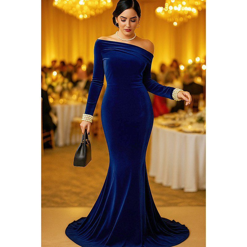 Mermaid Trumpet Floor Length Evening Gown Ball Gown Elegant Glittering Silky Long Sleeve Off Shoulder Wedding Formal Velvet with Pearls