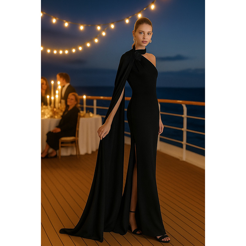 Sheath Column Floor Length Ball Gown with Cape Evening Gown Ball Gown Elegant High Split Sleeveless High Neck Wedding Formal Pocket Stretch Crepe with Pleats Appliques