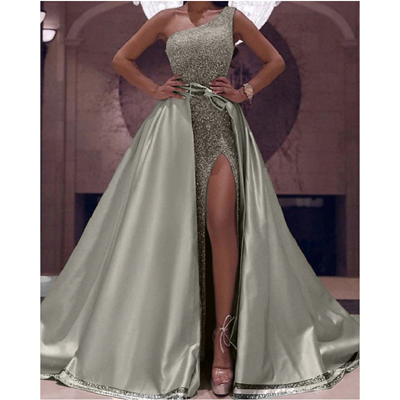 Ball Gown Floor Length Prom Dresses Evening Gown Ball Gown with Overskirt Formal Dress Sparkle Shine Sexy High Split Sleeveless One Shoulder Evening Party Wedding Guest Detachable Satin with Bow(s
