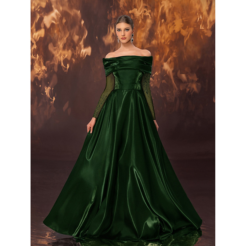A-Line Floor Length Prom Dresses Evening Gown Ball Gown Formal Dress Elegant Celebrity Style Sleeveless Off Shoulder Garden Party Wedding Stretch Satin with Pleats Beading